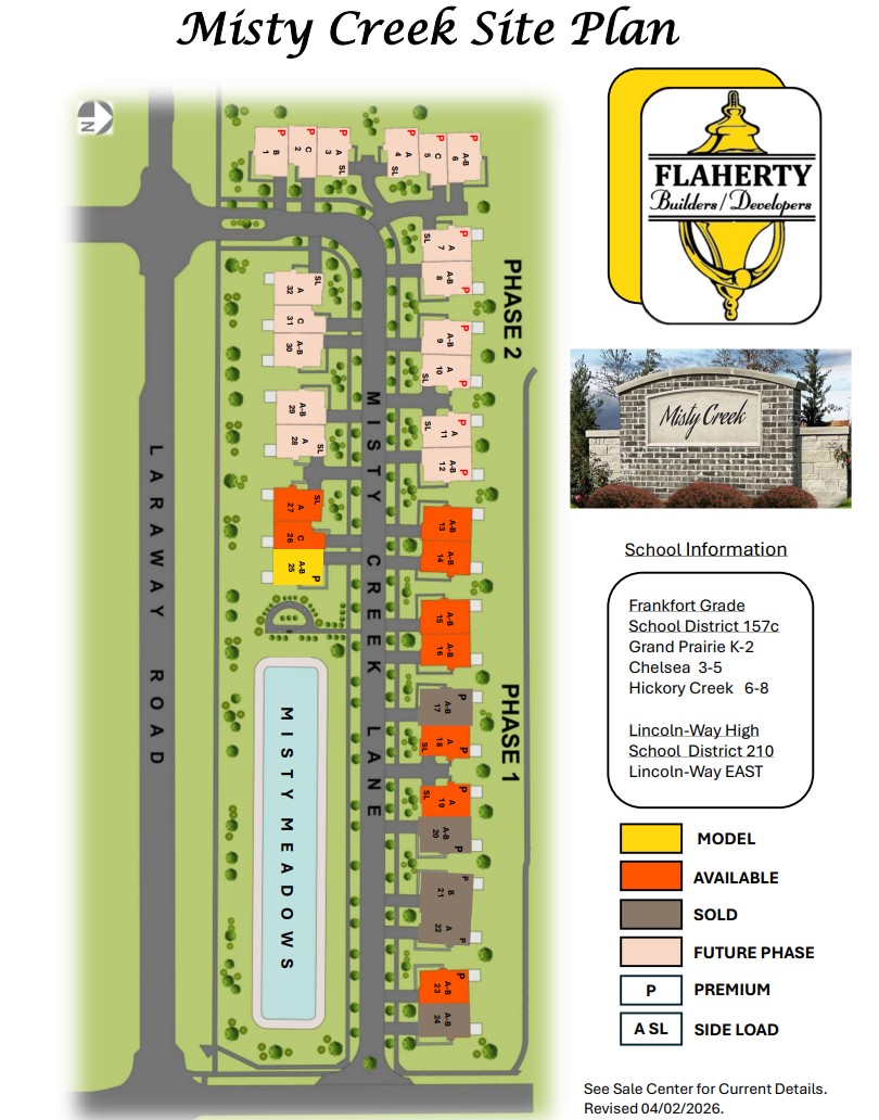 815-464-2213Misty Creek consists of 32 single-family townhomes – located off Laraway Road, a half mile west of Wolf Road in Frankfort, IL. Misty Creek offers two ranch-style plans and one 2-story plan in duplex and triplex layouts.